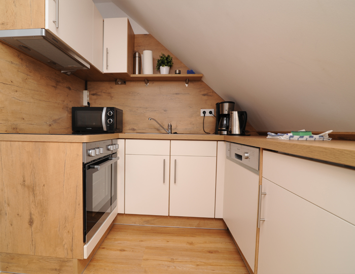 Die helle und modern eingerichtete Wohnung für maximal vier Personen im Ober- und Dachgeschoss hat eine Wohnfläche von 54 qm. Im Obergeschoss befinden sich das Wohn-/Esszimmer, die Küchenzeile, ein Schlafzimmer mit Doppelbett, das Badezimmer mit Dusche und ein Abstellraum. Im Dachgeschoss ist ein weiteres Schlafzimmer mit zwei Einzelbetten eingerichtet.